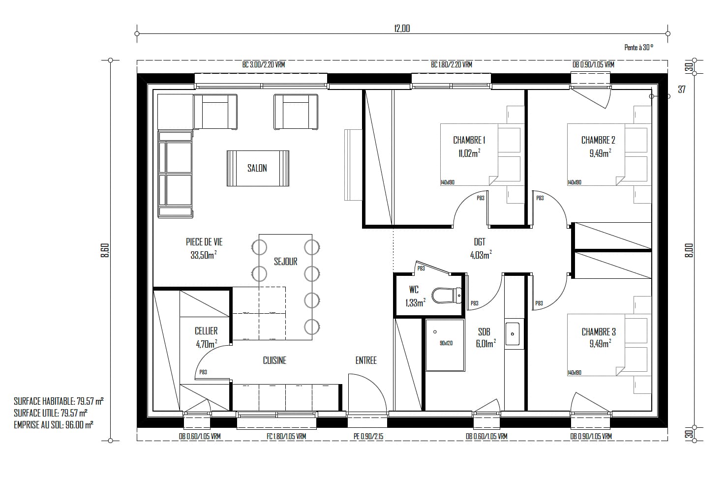 Toiture : Pente à 30° pour une esthétique de caractère.